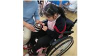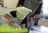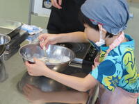 低学年(1~3年生)は、調理学習でフルーツヨーグルトを作りました。エプロンとバンダナを身に付け、手洗いをするところからの学習です。事前に、バナナに見立てた小麦粉粘土を切る学習を済ませてから、いざ本番!プラスチック製の子供用の包丁を使って慎重に材料を切りました。