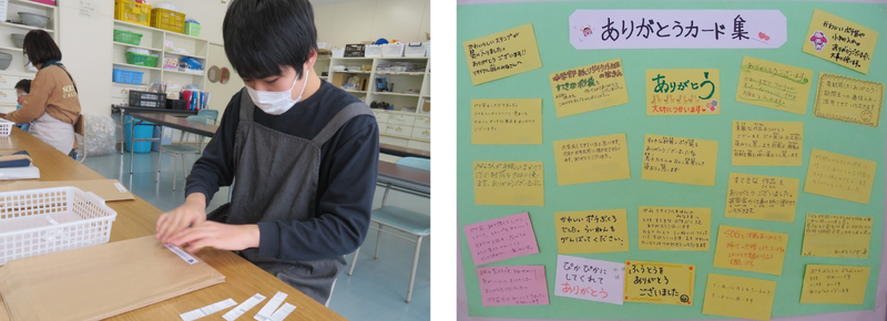 4月から取り組んできた作業学習の成果発表として、毎年、「働き体験」を実施しています。生徒たちは本校職員から注文を取り、納品日には製品包装や模擬店の接客を行いました。作業製品を受け取った職員からは、感謝の気持ちが書かれたありがとうカードをいただきました。